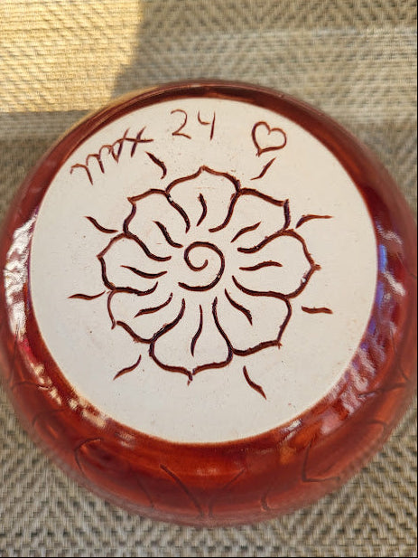 Made from durable stoneware clay, this handmade ceramic bowl is perfect for everyday use as a stunning decorative accent piece. The smooth glaze and intricate carving reflect the heart of Sun Sweet Ceramics -- art that carries warmth and meaning, and the message "you are loved."