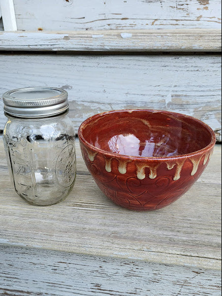 Amber cream glazes gently drip over a deep brick-red ceramic surface, creating a natural flow that feels both warm and organic. Each handcrafted bowl is carved with delicate floral design, adding depth and texture to it rich earth tones.