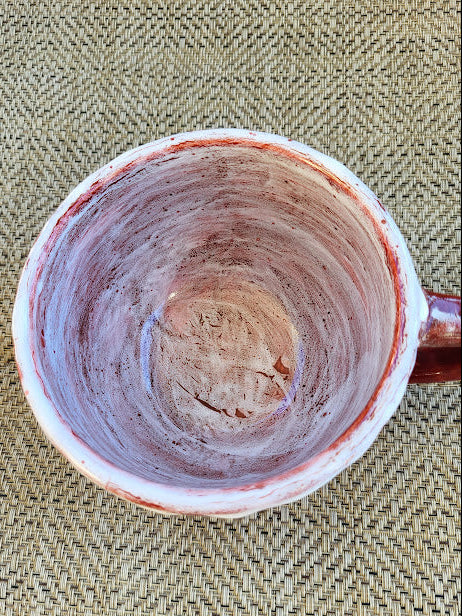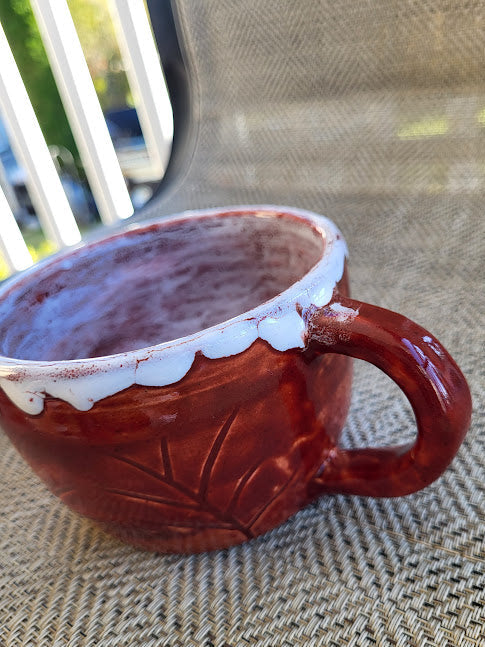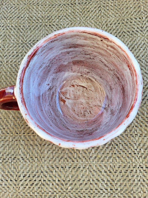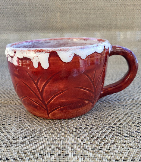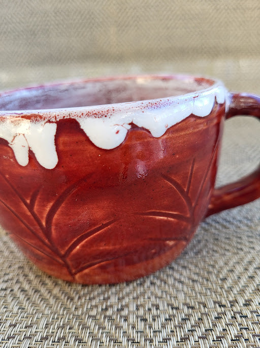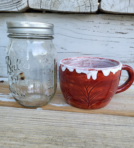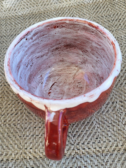 This handcrafted stoneware mug was created with the spirit of the winter holidays in mind. A deep brick-red glaze serves as the warm foundation, while a creamy white drip flows gently over the rim, evoking images of snow resting on a rooftop or whipped cream on a cup of cocoa.