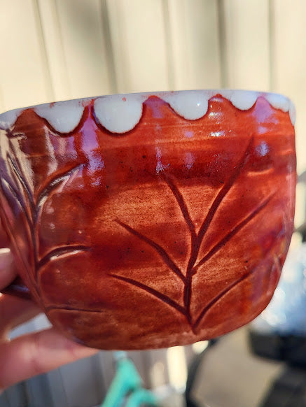 Delicate hand-carved leaf designs add texture and life to the surface, making this piece as inviting to hold as it is to admire. Perfect for sipping hot chocolate, coffee, or tea by the fire, this festive mug brings handmade charm and a touch of warmth to every winter day.